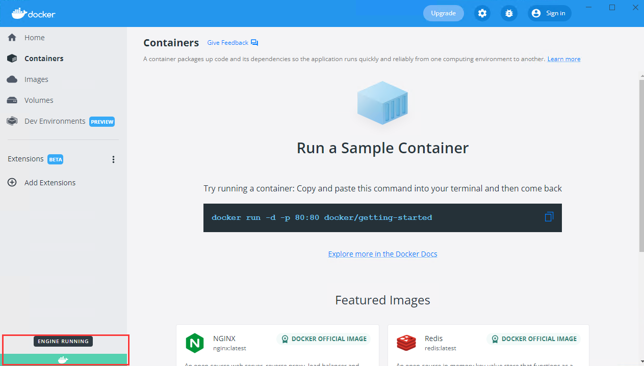 6. When the whale icon in the bottom left corner has a green background, it indicates that Docker is available.