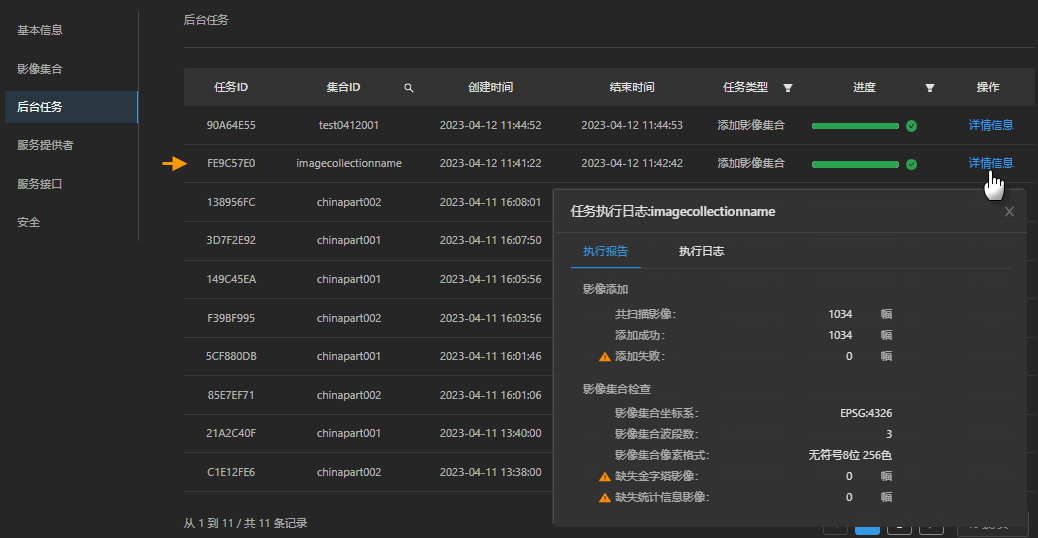 - After The task executed successfully is collected by adding image, click "Detail" to view the execution report, including: add image file summary information, add failed image list and failure reasons, and optimize image inspection results based on service management (for example, image pyramid and statistic infomation are missing) and optimization scheme.