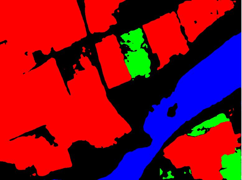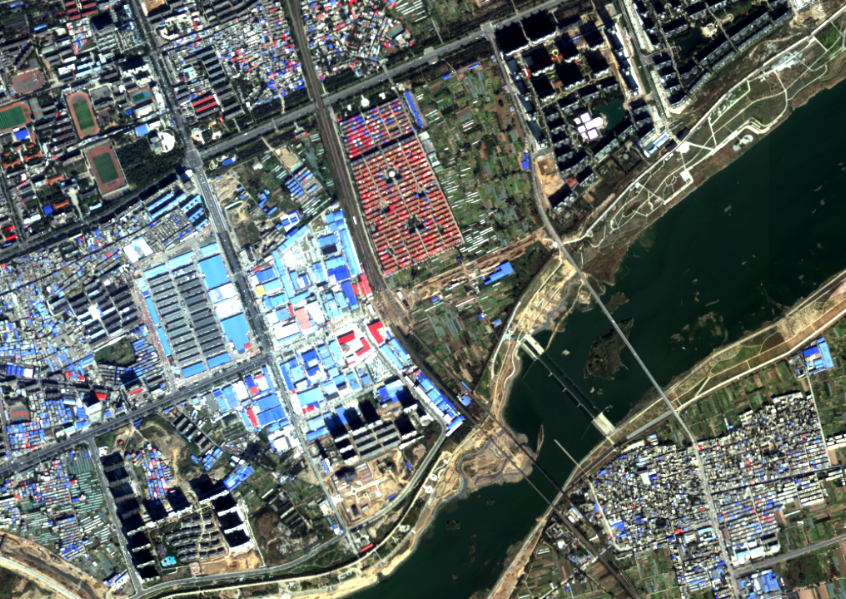 对影像进行地物分类,即利用遥感图像中各类地物光谱信息和空间信息进行分析,将图像中具有语义信息的各个像元分别赋予语义类别标签,实现地物分类,包括:建筑物、林地、草地、水田、农用地等。