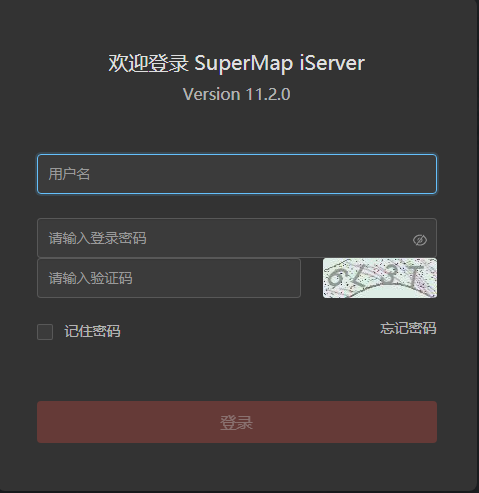进入 SuperMap iServer 登录界面后,管理员输入用户名和密码,即可登录 SuperMap iServer 服务管理器。